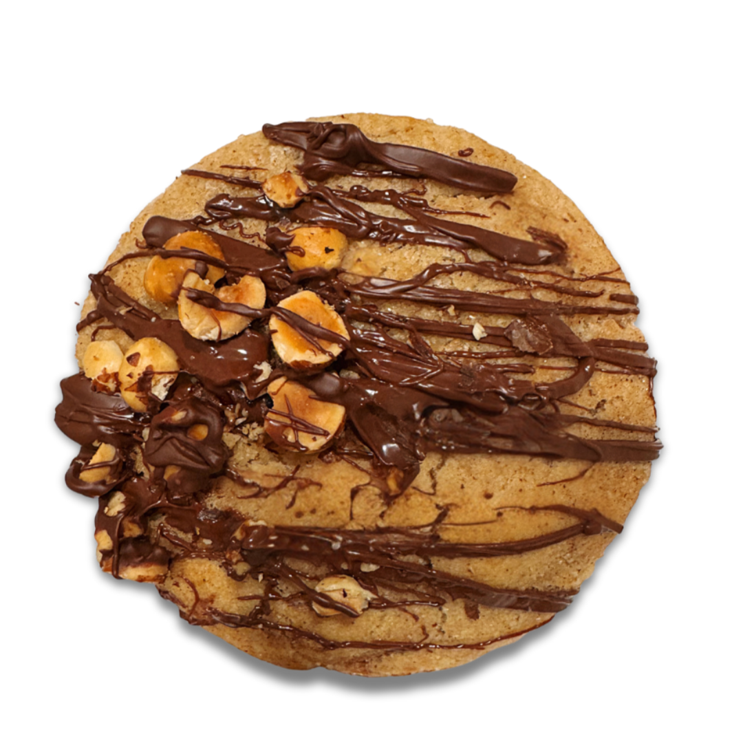 A soft cinnamon sugar cookie filled with smooth chocolate hazelnut spread, light chocolate drizzle on top, and a sprinkle of toasted hazelnuts for the perfect crunch.