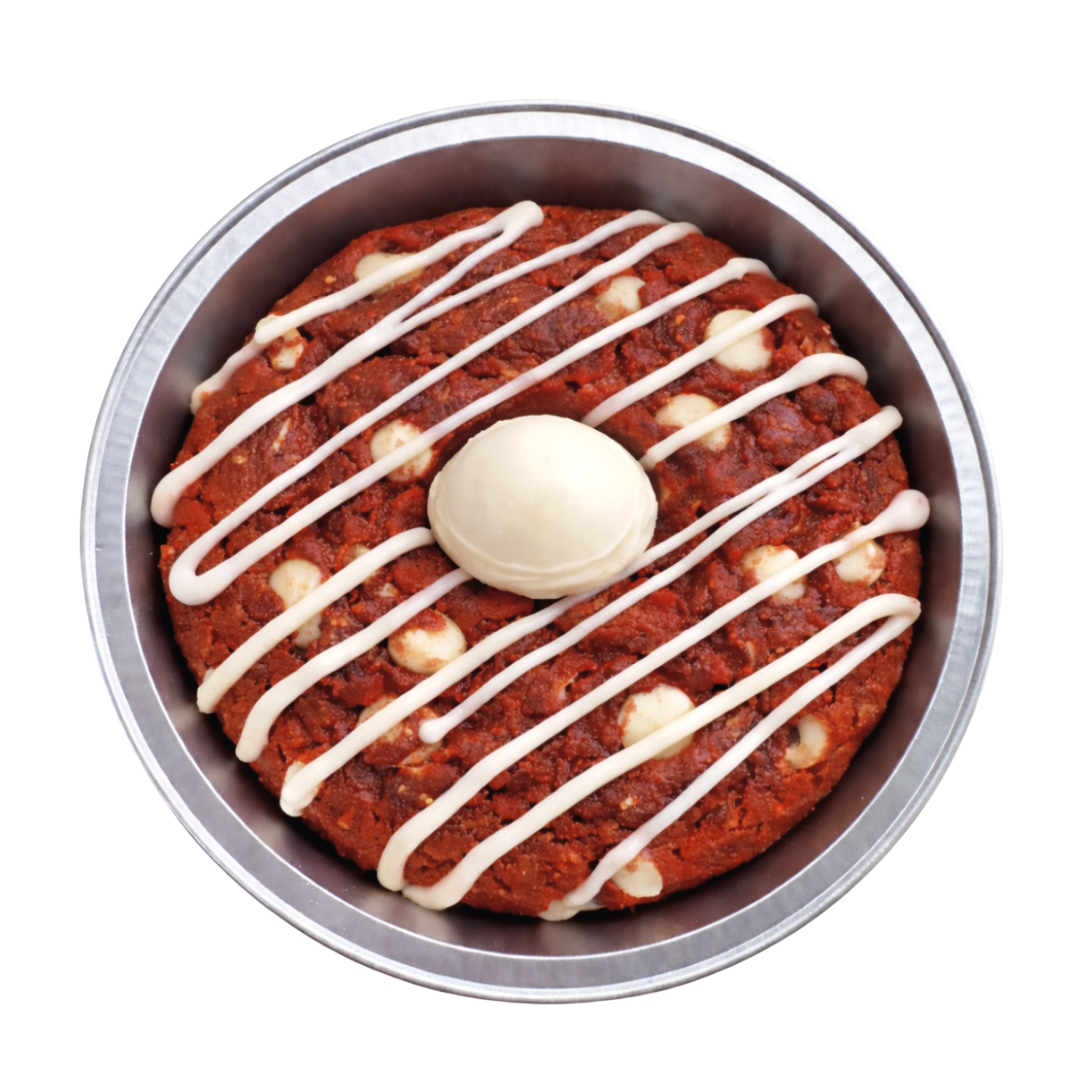 Soft Red Velvet cookie with white chocolate chips, finished with a light cream cheese icing drizzle and a white chocolate truffle on top.